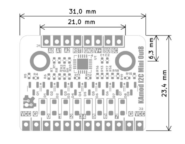 Wymiary płytki KAmod I2C-Mini Out8 to 31x23,5 mm. Na płytce znajdują się 2 otwory montażowe o średnicy 3,2 mm.