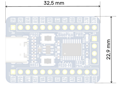 Wymiary płytki KAmod BluePico STM32F030 to 32,5x22,9 mm, a wysokość wynosi ok. 7 mm (bez wlutowanych szpilek goldpin).