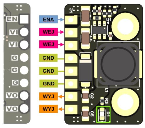 Na krawędzi płytki modułu znajdują się pady z otworami, rozmieszczonymi zgodnie z rastrem 2,54 mm. Można do nich przylutować szpilki goldpin lub przewody. Wejście (WEJ), wyjście (WYJ) oraz masa (GND) zasilania mają po kilka padów, dzięki czemu moduł można optymalnie dopasować do docelowej aplikacji.