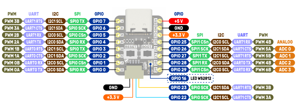 Miniaturowa płytka z mikrokontrolerem RP2040 wyposażonym w dwa rdzenie ARM Cortex-M0+ pracujące z częstotliwością 133 MHz, 264 kB RAM. Na płytce znajduje się aż 16 MB pamięci QSPI flash - maksymalny rozmiar obsługiwany przez mikrokontroler, a także 4 wejścia ADC, złącze I2C Qwire (kompatybilne z Qwiic/STEMMA QT) oraz dioda LED RGB WS2812.