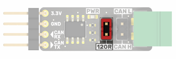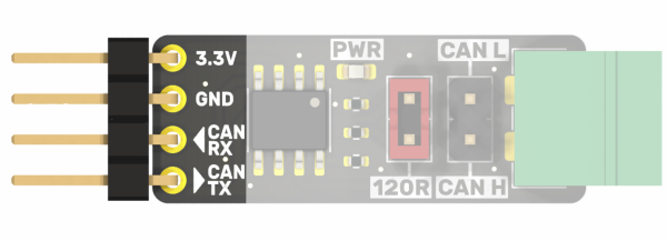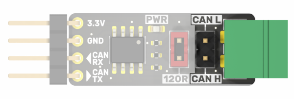 The bus lines are marked CAN L and CAN H and are available on a Phoenix MC connector and on goldpins with a standard 2.54 mm pitch. Their layout is shown in the drawing and is described on the top and bottom of the module board.