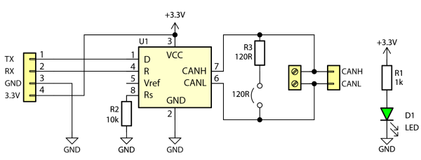 - SN65HVD230 transceiver, compatible with PCA82C250