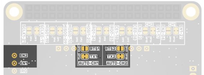 Wszystkie sygnały sterujące są wyprowadzone na złącze J2 (40-stykowe, kompatybilne z płytkami Raspberry Pi). Połączenie domyślne przekierowuje sygnały sterujące do wyprowadzeń interfejsu SPI-0 płytek Raspberry Pi. Oprócz połączenia domyślnego każdy sygnał może być przekierowany do połączenia opcjonalnego (sygnały interfejsu SPI-1 płytek Raspberry Pi) poprzez zmianę połączeń na zworkach SMD JP1…JP18. Aby zmienić konfigurację połączenia, należy przeciąć połączenie pomiędzy padami jednej zworki i kroplą spoiwa lutowniczego połączyć pady drugiej zworki, dla danego sygnału. Konfiguracja połączeń domyślnych i opcjonalnych została opisana w tabeli oraz na dolnej stronie płytki.
