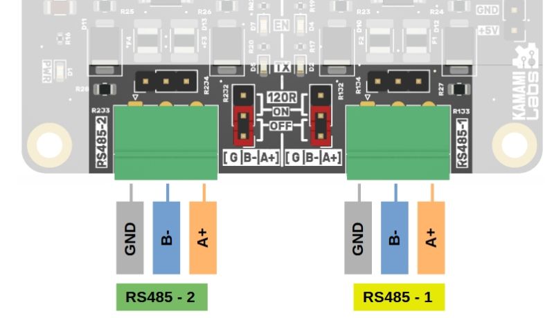 Interfejsy RS485 są sterowane transceiverami typu ST485, z oddzielonymi galwanicznie sygnałami sterującymi. Linie magistrali są oznaczone jako: A(+), B(-) oraz masa GND i są dostępne na złączu typu Phoenix MC (R1J3, R2J3) oraz na szpilkach goldpin o standardowym rastrze 2,54 mm (R1J4, R2J4). Ich rozmieszczenie zostało pokazane na rysunku oraz jest opisane na dolnej stronie płytki modułu. Linie magistrali RS485 są wyposażone w obwody chroniące przed przepięciami.
