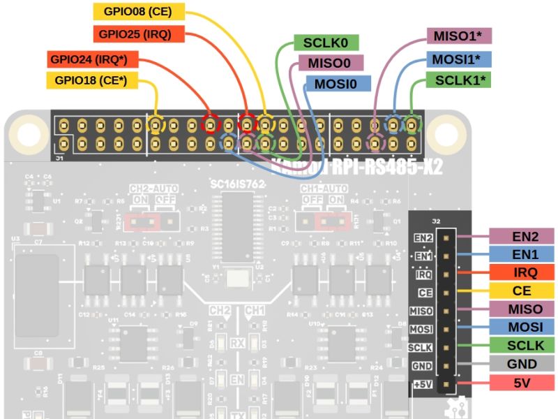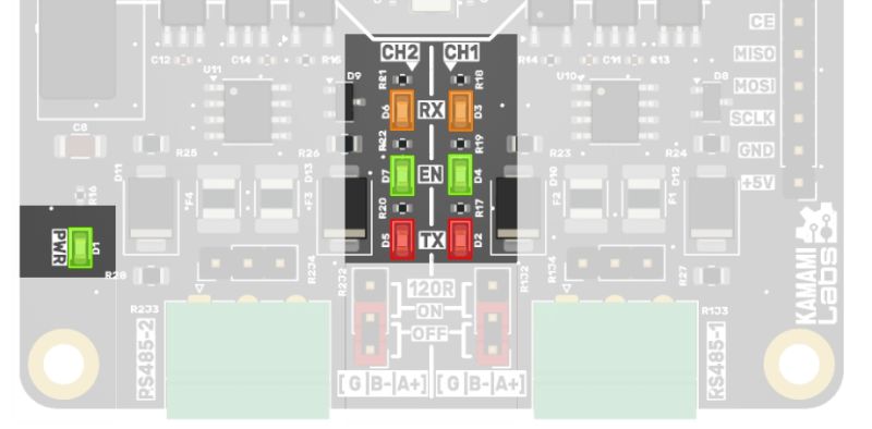 Interfejsy RS485 są realizowane poprzez kontroler SC16IS762, którego dokładny opis jest dostępny w dokumentacji producenta. Kontroler jest sterowany poprzez interfejs SPI (MISO, MOSI, SCLK, CE), a dodatkowo generuje sygnał przerwania IRQ. Tryb pracy transceiverów RS485 może być sterowany sygnałami EN CH1 oraz EN CH2.