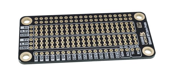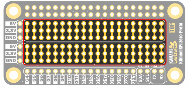 Płytka uniwersalna KAmod RPi Zero Proto zawiera siatkę otworów metalizowanych rozmieszczonych w standardowym rastrze 2,54 mm i połączonych w grupy. Jest to charakterystyczna struktura każdej płytki uniwersalnej, która ułatwia tworzenie prostych obwodów elektronicznych. Dodatkowo na płytce wyprowadzono i opisano 16 standardowych GPIO, zasilanie, interfejs I2C oraz UART.