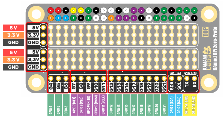 Na płytce KAmod RPi Zero Proto zostały wyprowadzone na dodatkowych złączach napięcia zasilające, 16 standardowych porów GPIO oraz najważniejsze interfejsy dostępne na złączu szpilkowym GPIO komputerka Raspberry Pi. Ich rozmieszczenie zostało uporządkowane i czytelnie oznaczone