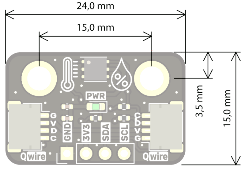 The KAmod Si7021 board dimensions are 25x15 mm. There are two mounting holes on the board, each with a diameter of 3.2 mm.