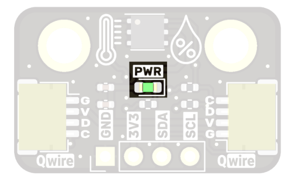 The board is powered via the Qwire connector (compatible with Qwiic / STEMMA QT) or a pin header on the +3V3 and GND pins. The presence of power is indicated by the LED marked PWR illuminated.